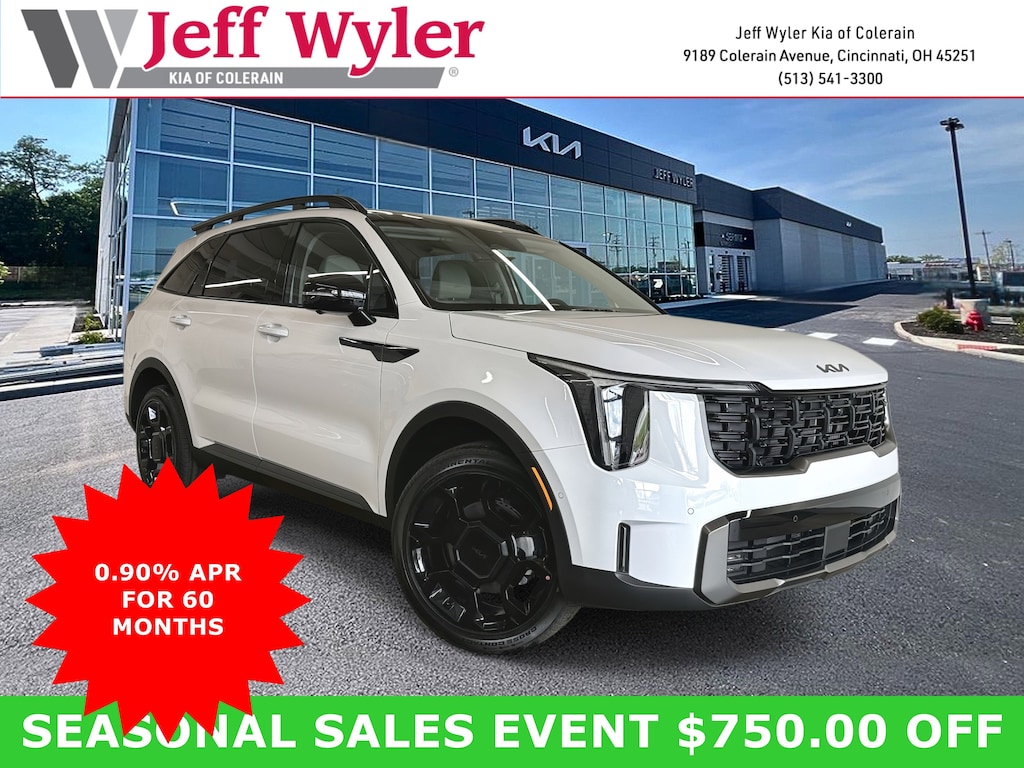 Jeff Wyler Kia of Colerain is delighted to offer this gorgeous-looking 2025 Kia Sorento X-Line SX in Glacial White Pearl. 3rd row seats: split-bench, 4-Wheel Disc Brakes, 6 Speakers, ABS brakes, Air Conditioning, Alloy wheels, AM/FM radio: SiriusXM, Apple CarPlay & Android Auto, Auto High-beam Headlights, Auto-dimming Rear-View mirror, Automatic temperature control, Brake assist, Bumpers: body-color, Delay-off headlights, Driver door bin, Driver vanity mirror, Dual front impact airbags, Dual front side impact airbags, Electronic Stability Control, Emergency communication system: 911 Connect, Exterior Parking Camera Rear, Four wheel independent suspension, Front anti-roll bar, Front Bucket Seats, Front Center Armrest, Front dual zone A/C, Front fog lights, Front reading lights, Fully automatic headlights, Heated & Ventilated Front Bucket Seats, Heated door mirrors, Heated front seats, Illuminated entry, Knee airbag, Leather Shift Knob, Leather steering wheel, Low tire pressure warning, Navigation System, Occupant sensing airbag, Outside temperature display, Overhead airbag, Overhead console, Panic alarm, Passenger door bin, Passenger vanity mirror, Power door mirrors, Power driver seat, Power Liftgate, Power moonroof, Power passenger seat, Power steering, Power windows, Radio data system, Radio: AM/FM Standard Sound System, Rain sensing wipers, Rear anti-roll bar, Rear reading lights, Rear side impact airbag, Rear window defroster, Rear window wiper, Remote keyless entry, Security system, Speed control, Speed-sensing steering, Split folding rear seat, Spoiler, Steering wheel mounted audio controls, SynTex Artificial Leather Seat Trim, Tachometer, Telescoping steering wheel, Tilt steering wheel, Traction control, Trip computer, Turn signal indicator mirrors, Variably intermittent wipers, Ventilated front seats, and Wheels: 20" Gloss Black X-Line Alloy Our PRE-OWNED vehicles are put through a rigorous 167- POINT QUALITY ASSURANCE INSPECTION along with an average amount of over $1,400.00 SPENT to recondition each vehicle so we can be sure to deliver you the highest quality vehicle like you deserve! ***ONLINE PRICE DOES NOT INCLUDE WYLER FAMILY FIRST PACKAGE*** Price includes: $750 - Sticker Sales Event Retail Bonus Cash. Exp. 12/01/2025
