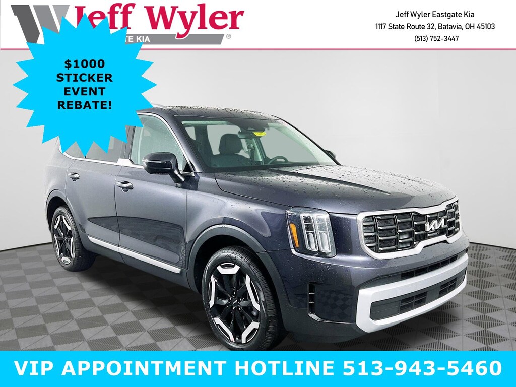Priced below KBB Fair Purchase Price! Panthera Metal 2025 Kia Telluride S 3.8L V6 DOHC AWD 8-Speed Automatic 18/23 City/Highway MPG Jeff Wyler Eastgate Auto Mall is excited to offer this good-looking 2025 Kia Telluride S in Panthera Metal. Well equipped with: 3rd row seats: split-bench, 4-Wheel Disc Brakes, 6 Speakers, ABS brakes, Air Conditioning, Alloy wheels, AM/FM radio: SiriusXM, Apple CarPlay & Android Auto, Auto High-beam Headlights, Automatic temperature control, Brake assist, Bumpers: body-color, Carpeted Floor Mats, Delay-off headlights, Driver door bin, Driver vanity mirror, Dual front impact airbags, Dual front side impact airbags, Electronic Stability Control, Emergency communication system: 911 Connect, Exterior Parking Camera Rear, Four wheel independent suspension, Front anti-roll bar, Front Bucket Seats, Front Center Armrest, Front dual zone A/C, Front reading lights, Fully automatic headlights, Heated door mirrors, Heated Front Bucket Seats, Heated front seats, Illuminated entry, Knee airbag, Leather Shift Knob, Leather steering wheel, Low tire pressure warning, Navigation System, Occupant sensing airbag, Outside temperature display, Overhead airbag, Overhead console, Panic alarm, Passenger door bin, Passenger vanity mirror, Power door mirrors, Power driver seat, Power Liftgate, Power moonroof, Power steering, Power windows, Radio data system, Radio: AM/FM Display Audio System, Rear air conditioning, Rear anti-roll bar, Rear audio controls, Rear reading lights, Rear side impact airbag, Rear window defroster, Rear window wiper, Reclining 3rd row seat, Remote keyless entry, Security system, Speed control, Speed-sensing steering, Split folding rear seat, Spoiler, Steering wheel mounted audio controls, SynTex Synthetic Leather Seat Trim, Tachometer, Telescoping steering wheel, Tilt steering wheel, Traction control, Trip computer, Turn signal indicator mirrors, Variably intermittent wipers, and Wheels: 20" x 7.5" Black Finish. Price includes: $1000 - Sticker Sales Event Retail Bonus Cash. Exp. 01/02/2026