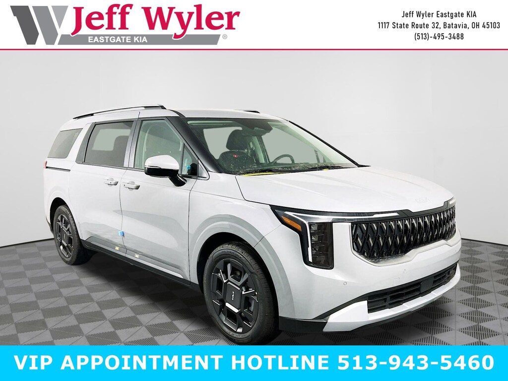 Ceramic Silver 2026 Kia Carnival Hybrid EX 1.6L I4 DGI Hybrid Turbocharged DOHC 16V LEV3-SULEV30 FWD 6-Speed Automatic 34/31 City/Highway MPG Jeff Wyler Eastgate Auto Mall is honored to offer this wonderful 2026 Kia Carnival Hybrid EX in Ceramic Silver. Well equipped with: 3rd row seats: split-bench, 4-Wheel Disc Brakes, 8 Speakers, ABS brakes, Air Conditioning, All Weather Floor Mats (8-Passenger), Alloy wheels, AM/FM radio: SiriusXM, Apple CarPlay & Android Auto, Artificial Leather Seat Trim, Auto High-beam Headlights, Auto-Dimming Mirror with HomeLink, Automatic temperature control, Brake assist, Bumpers: body-color, Compass, Delay-off headlights, Driver door bin, Driver vanity mirror, Dual front impact airbags, Dual front side impact airbags, Electronic Stability Control, Emergency communication system, Exterior Parking Camera Rear, Four wheel independent suspension, Front anti-roll bar, Front Bucket Seats, Front Center Armrest, Front dual zone A/C, Front reading lights, Fully automatic headlights, Heated door mirrors, Heated Front Bucket Seats, Heated front seats, Illuminated entry, Knee airbag, Leather Shift Knob, Leather steering wheel, Low tire pressure warning, Memory seat, Navigation System, Occupant sensing airbag, Outside temperature display, Overhead airbag, Overhead console, Panic alarm, Passenger door bin, Passenger vanity mirror, Power door mirrors, Power driver seat, Power Liftgate, Power passenger seat, Power steering, Power windows, Radio: : Navigation System with SiriusXM, Rear air conditioning, Rear anti-roll bar, Rear reading lights, Rear window defroster, Rear window wiper, Reclining 3rd row seat, Remote keyless entry, Security system, Speed control, Speed-sensing steering, Split folding rear seat, Spoiler, Steering wheel mounted audio controls, Tachometer, Telescoping steering wheel, Tilt steering wheel, Traction control, Trip computer, Turn signal indicator mirrors, Variably intermittent wipers, and Wheels: 19" Black Alloy. 34/31 City/Highway MPG