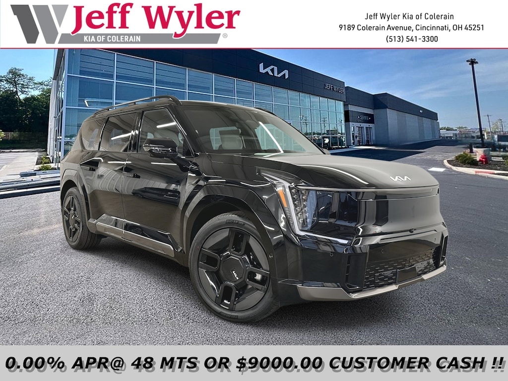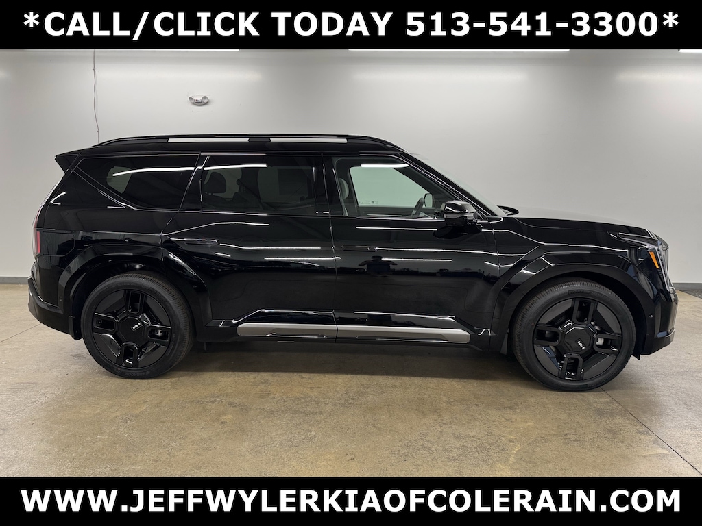Jeff Wyler Kia of Colerain is pumped up to offer this terrific-looking 2026 Kia EV9 GT-Line in Ebony Black. 14 Speakers, 3rd row seats: split-bench, 4-Wheel Disc Brakes, ABS brakes, Air Conditioning, Alloy wheels, AM/FM radio: SiriusXM, Apple CarPlay & Android Auto, Auto High-beam Headlights, Auto-dimming door mirrors, Auto-dimming Rear-View mirror, Auto-leveling suspension, Automatic temperature control, Brake assist, Bumpers: body-color, Carpeted Floor Mat, 6-Passenger, Delay-off headlights, Driver door bin, Driver vanity mirror, Dual front impact airbags, Dual front side impact airbags, Electronic Stability Control, Emergency communication system: 911 Connect, Exterior Parking Camera Rear, Folding Cargo Tray, Four wheel independent suspension, Front anti-roll bar, Front Bucket Seats, Front Center Armrest w/Storage, Front dual zone A/C, Front reading lights, Full SynTex Leather Seat Trim, Fully automatic headlights, Garage door transmitter: HomeLink, Heads-Up Display, Heated & Ventilated Front Bucket Seats, Heated door mirrors, Heated front seats, Heated rear seats, Heated steering wheel, Illuminated entry, Knee airbag, Low tire pressure warning, Memory seat, Mud Guards, Navigation System, Occupant sensing airbag, Outside temperature display, Overhead airbag, Overhead console, Panic alarm, Passenger door bin, Passenger vanity mirror, Power door mirrors, Power driver seat, Power Liftgate, Power moonroof, Power passenger seat, Power steering, Power windows, Radio data system, Radio: AM/FM/HD Radio/SiriusXM, Rain sensing wipers, Rear air conditioning, Rear anti-roll bar, Rear reading lights, Rear seat center armrest, Rear window defroster, Rear window wiper, Reclining 3rd row seat, Remote keyless entry, Security system, Speed control, Speed-sensing steering, Split folding rear seat, Spoiler, Steering wheel memory, Steering wheel mounted audio controls, Telescoping steering wheel, Tilt steering wheel, Traction control, Trip computer, Turn signal indicator mirrors, Variably intermittent wipers, Ventilated front seats, Ventilated rear seats, and Wheels: 21" Black & Dark Silver Finish Alloy Our PRE-OWNED vehicles are put through a rigorous 167- POINT QUALITY ASSURANCE INSPECTION along with an average amount of over $1,400.00 SPENT to recondition each vehicle so we can be sure to deliver you the highest quality vehicle like you deserve! ***ONLINE PRICE DOES NOT INCLUDE WYLER FAMILY FIRST PACKAGE***