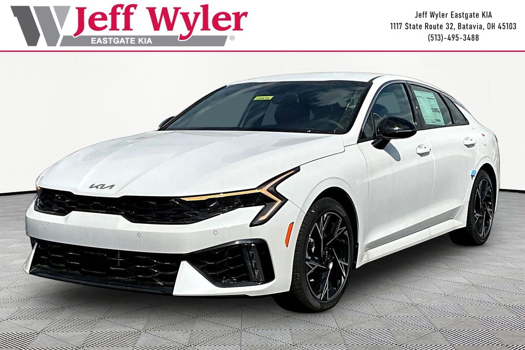 Snow White Pearl 2026 Kia K5 GT-Line I4 AWD 8-Speed Automatic 24/33 City/Highway MPG Jeff Wyler Eastgate Auto Mall is pleased to offer this good-looking 2026 Kia K5 GT-Line in Snow White Pearl. Well equipped with: GT-Line Red Interior Package (SynTex Seat Trim), 4-Wheel Disc Brakes, 6 Speakers, ABS brakes, Air Conditioning, Alloy wheels, AM/FM radio: SiriusXM, Apple CarPlay & Android Auto, Auto High-beam Headlights, Automatic temperature control, Brake assist, Bumpers: body-color, Delay-off headlights, Driver door bin, Driver vanity mirror, Dual front impact airbags, Dual front side impact airbags, Electronic Stability Control, Emergency communication system: Kia Connect (includes 1 year free trial), Four wheel independent suspension, Front anti-roll bar, Front Bucket Seats, Front Center Armrest, Front dual zone A/C, Front fog lights, Front reading lights, Fully automatic headlights, Heated door mirrors, Heated Front Bucket Seats, Heated front seats, Heated steering wheel, Illuminated entry, Knee airbag, Leather Shift Knob, Leather steering wheel, Low tire pressure warning, Navigation System, Occupant sensing airbag, Outside temperature display, Overhead airbag, Overhead console, Panic alarm, Passenger door bin, Passenger vanity mirror, Power door mirrors, Power driver seat, Power steering, Power windows, Radio data system, Radio: AM/FM Audio System, Rear anti-roll bar, Rear seat center armrest, Rear side impact airbag, Rear window defroster, Remote keyless entry, Security system, Speed control, Speed-sensing steering, Split folding rear seat, Sport steering wheel, Steering wheel mounted audio controls, Tachometer, Telescoping steering wheel, Tilt steering wheel, Traction control, Trip computer, Turn signal indicator mirrors, Variably intermittent wipers, and Wheels: 18" x 7.5J Gloss Black Machined Finish Alloy. 24/33 City/Highway MPG