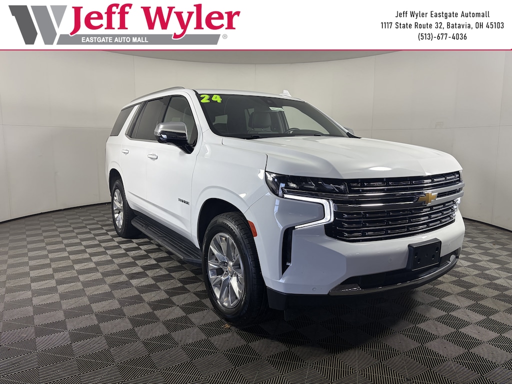 Jeff Wyler Eastgate Auto Mall is pumped up to offer this beautiful 2024 Chevrolet Tahoe Premier in Summit White. Well equipped with: License Plate Front Mounting Package, Preferred Equipment Group 1LZ (1st & 2nd Row Color-Keyed Carpeted Floor Mats, 2-Speed Active Electronic AutoTrac Transfer Case, 3rd Row 60/40 Power-Folding Split-Bench Seat, Auto-Dimming Inside Rear-View Mirror, Bose 10-Speaker Centerpoint Surround Audio Sys Ft, Bright Front & Rear Door Sill Plates, Chrome Door Handles w/Body-Color Strip, Chrome Mirror Caps, Color-Keyed Carpeting Floor Covering, Driver & Front Outboard Passenger Airbags, Dual Exhaust System, Enhanced Driver Information Center, Floor Console, Hands-Free Rear Power Programmable Liftgate, Heated 2nd Row Outboard Seats, Heated Steering Wheel, Hill Descent Control, Lane Change Alert w/Side Blind Zone Alert, LED Daytime Running Lamps, Memory Settings, Outside Heated Power-Adjustable Mirrors, Power Release 2nd Row Bucket Seats, Power Tilt & Telescopic Steering Column, Rear Cross Traffic Alert, Remote Start, Safety Alert Seat, SiriusXM w/360L, Universal Home Remote, Wireless Charging, and Wrapped Steering Wheel), 10 Speakers, 12-Way Power Driver & Passenger Seat Adjusters, 20" x 9" Polished Aluminum Wheels, 3.23 Rear Axle Ratio, 3rd row seats: split-bench, 4-Wheel Disc Brakes, ABS brakes, Adaptive suspension, Air Conditioning, Alloy wheels, AM/FM radio: SiriusXM with 360L, Apple CarPlay/Android Auto, Auto High-beam Headlights, Auto-dimming door mirrors, Auto-dimming Rear-View mirror, Auto-leveling suspension, Automatic temperature control, Brake assist, Bumpers: body-color, Compass, Delay-off headlights, Deleted 3 Years of OnStar Remote Access, Driver & Front Passenger Heated & Ventilated Seats, Driver door bin, Driver vanity mirror, Dual front impact airbags, Dual front side impact airbags, Electronic Stability Control, Emergency communication system: OnStar and Chevrolet connected services capable, Four wheel independent suspension, Front anti-roll bar, Front Bucket Seats, Front Center Armrest, Front dual zone A/C, Front High-Back Reclining Bucket Seats, Front reading lights, Fully automatic headlights, Garage door transmitter, Heated door mirrors, Heated Driver & Front Passenger Seats, Heated front seats, Heated rear seats, Heated steering wheel, Illuminated entry, Infotainment Display, Low tire pressure warning, Magnetic Ride Control Suspension, Memory seat, Navigation System, Occupant sensing airbag, Outside temperature display, Overhead airbag, Overhead console, Panic alarm, Passenger door bin, Passenger vanity mirror, Perforated Leather Seat Trim, Power door mirrors, Power driver seat, Power Liftgate, Power passenger seat, Power steering, Power windows, Premium audio system: Chevrolet Infotainment 3 Premium, Radio: Chevrolet Infotainment 3 Premium System, Rain sensing wipers, Rear air conditioning, Rear anti-roll bar, Rear reading lights, Rear window defroster, Rear window wiper, Remote keyless entry, Roof rack: xxxxxx, Security system, Speed control, Speed-sensing steering, Split folding rear seat, Spoiler, Steering wheel memory, Steering wheel mounted audio controls, Tachometer, Telescoping steering wheel, Tilt steering wheel, Traction control, Trip computer, Turn signal indicator mirrors, Variably intermittent wipers, Ventilated front seats, and Voltmeter. Clean CARFAX. Ask about available certifications. Used vehicles 10 years of age or newer with less than 100,000 miles are eligible for the Wyler Assurance Program, but eligible vehicles must pass our reconditioning process and multi-point inspection. Provided the vehicle passes inspection, vehicles will be eligible for the 6 month/6,000 mile limited warranty. The 6 month/6,000 mile limited warranty is NOT available on AS-IS vehicles, wholesale vehicles, lease buyback/pass-thru vehicles or un-inspected vehicles. Note that this program can also apply to vehicles where the remaining factory coverage is less than 6 months or 6,000 miles. Plea