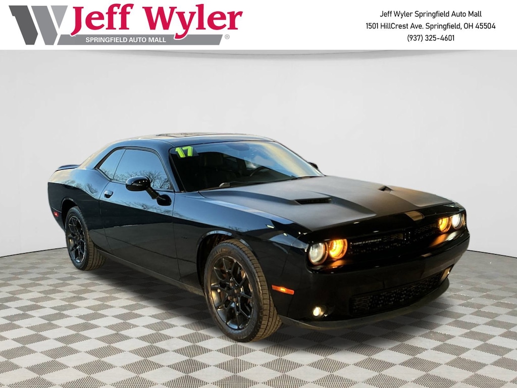 Jeff Wyler Springfield Auto Mall is excited to offer this attractive-looking 2017 Dodge Challenger GT in Pitch Black Clearcoat. Well equipped with: Driver Convenience Group (Blind Spot & Cross Path Detection, High-Intensity Discharge Headlamps, Power Multi-Function Foldaway Mirrors, Remote Start System, and Universal Garage Door Opener), Quick Order Package 21B, 1-YR SiriusXM Guardian Trial, 4-Wheel Disc Brakes, 5-Year SiriusXM Traffic Service, 5-Year SiriusXM Travel Link Service, 6 Speakers, 8.4" Touchscreen Display, ABS brakes, Air Conditioning, Alloy wheels, AM/FM radio: SiriusXM, Anti-whiplash front head restraints, Apple CarPlay, Apple CarPlay/Android Auto, Auto-dimming Rear-View mirror, Automatic temperature control, Brake assist, Bumpers: body-color, Compass, Delay-off headlights, Driver door bin, Driver vanity mirror, Dual front impact airbags, Dual front side impact airbags, Electronic Stability Control, Four wheel independent suspension, Front anti-roll bar, Front Bucket Seats, Front Center Armrest, Front dual zone A/C, Front fog lights, Front reading lights, Fully automatic headlights, Garage door transmitter, Google Android Auto, GPS Antenna Input, GPS Navigation, HD Radio, Heated door mirrors, Heated Front Seats, Heated front seats, Heated steering wheel, Illuminated entry, Integrated Center Stack Radio, Integrated Voice Command w/Bluetooth, Leather Shift Knob, Leather Trim Seats, Low tire pressure warning, Media Hub (2 USB, AUX), Nappa Leather Sport Seat, Outside temperature display, Overhead airbag, Overhead console, Panic alarm, ParkView Rear Back-Up Camera, Passenger door bin, Passenger vanity mirror, Power door mirrors, Power driver seat, Power steering, Power windows, Radio data system, Radio: Uconnect 4C Nav w/8.4" Display, Radio: Uconnect 4C w/8.4" Display, Rear anti-roll bar, Rear reading lights, Rear seat center armrest, Rear window defroster, Remote keyless entry, Security system, SiriusXM Satellite Radio, SiriusXM Traffic Plus, SiriusXM Travel Link, Speed control, Speed-sensing steering, Split folding rear seat, Spoiler, Steering wheel mounted audio controls, Tachometer, Telescoping steering wheel, Tilt steering wheel, Traction control, Trip computer, USB Host Flip, Variably intermittent wipers, Ventilated Front Seats, Ventilated front seats, and Wheels: 19" x 7.5" Aluminum Painted Hyperblack. Awards: * JD Power Automotive Performance, Execution and Layout (APEAL) Study Reviews: * Many strong engine choices, including the gonzo 707-hp Hellcat V8; roomy cabin can actually accommodate four adults; high degree of customization thanks to many trim levels and options; ride is pretty comfortable compared to its muscle-car rivals Source: EdmundsAsk about available certifications. Used vehicles 10 years of age or newer with less than 100,000 miles are eligible for the Wyler Assurance Program, but eligible vehicles must pass our reconditioning process and multi-point inspection. Provided the vehicle passes inspection, vehicles will be eligible for the 6 month/6,000 mile limited warranty. The 6 month/6,000 mile limited warranty is NOT available on AS-IS vehicles, wholesale vehicles, lease buyback/pass-thru vehicles or un-inspected vehicles. Note that this program can also apply to vehicles where the remaining factory coverage is less than 6 months or 6,000 miles. Please check the Federal Trade Commission (FTC) Buyers guide on the vehicle for full details as to whether or not warranty coverage may apply. Contact Dealer for additional details. The Wyler Assurance 6 month/6,000 Mile limited warranty ends 6 months from the date of the Retail Purchase Agreement (BUYERS ORDER) or when the vehicle's odometer registers 6,000 additional miles to the mileage listed on the BUYERS ORDER, whichever comes first. Your Deductible - The warranty holder on your contract pays the first $100 of each covered repair.