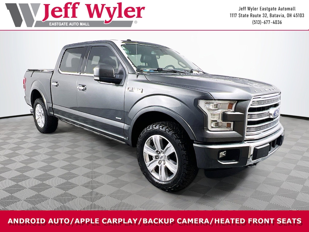Jeff Wyler Eastgate Auto Mall is excited to offer this handsome 2016 Ford F-150 Limited in Magnetic. Well equipped with: Equipment Group 900A Base, GVWR: 6,750 lbs Payload Package, Trailer Tow Package (Pro Trailer Backup Assist), 10 Speakers, 22" Polished Aluminum Wheels, 4-Wheel Disc Brakes, ABS brakes, Active Park Assist, Adjustable pedals, Air Conditioning, All-Weather Rubber Floor Mats, Alloy wheels, AM/FM radio: SiriusXM, Auto High-beam Headlights, Auto tilt-away steering wheel, Auto-dimming door mirrors, Auto-dimming Rear-View mirror, Automatic temperature control, Brake assist, Bumpers: chrome, CD player, Compass, Delay-off headlights, Driver door bin, Driver vanity mirror, Dual front impact airbags, Dual front side impact airbags, Electronic Stability Control, Extended Range 36 Gallon Fuel Tank, Exterior Parking Camera Rear, Foldable Pickup Box Bed Extender, Front anti-roll bar, Front Bucket Seats, Front Center Armrest, Front dual zone A/C, Front fog lights, Front License Plate Bracket, Front reading lights, Front wheel independent suspension, Fully automatic headlights, Garage door transmitter, Genuine wood door panel insert, Heated door mirrors, Heated front seats, Heated rear seats, Heated steering wheel, Illuminated entry, Low tire pressure warning, Memory seat, Navigation System, Occupant sensing airbag, Outside temperature display, Overhead airbag, Overhead console, Panic alarm, Passenger door bin, Passenger vanity mirror, Pedal memory, Power door mirrors, Power driver seat, Power moonroof: Vista Roof, Power passenger seat, Power steering, Power windows, Radio data system, Radio: Sony Single CD w/HD & SiriusXM Satellite, Rain sensing wipers, Rear Parking Sensors, Rear reading lights, Rear seat center armrest, Rear step bumper, Rear window defroster, Remote keyless entry, Security system, Speed control, Speed-sensing steering, Split folding rear seat, Steering wheel memory, Steering wheel mounted audio controls, SYNC 3, Tachometer, Tailgate Step w/Tailgate Lift Assist, Telescoping steering wheel, Tilt steering wheel, Traction control, Trip computer, Turn signal indicator mirrors, Unique Leather Bucket Seats, Variably intermittent wipers, Ventilated front seats, Voice-Activated Navigation, and Voltmeter. Clean CARFAX. Awards: * 2016 KBB.com Brand Image Awards Ask about available certifications. Used vehicles 10 years of age or newer with less than 100,000 miles are eligible for the Wyler Assurance Program, but eligible vehicles must pass our reconditioning process and multi-point inspection. Provided the vehicle passes inspection, vehicles will be eligible for the 6 month/6,000 mile limited warranty. The 6 month/6,000 mile limited warranty is NOT available on AS-IS vehicles, wholesale vehicles, lease buyback/pass-thru vehicles or un-inspected vehicles. Note that this program can also apply to vehicles where the remaining factory coverage is less than 6 months or 6,000 miles. Please check the Federal Trade Commission (FTC) Buyers guide on the vehicle for full details as to whether or not warranty coverage may apply. Contact Dealer for additional details. The Wyler Assurance 6 month/6,000 Mile limited warranty ends 6 months from the date of the Retail Purchase Agreement (BUYERS ORDER) or when the vehicle's odometer registers 6,000 additional miles to the mileage listed on the BUYERS ORDER, whichever comes first. Your Deductible - The warranty holder on your contract pays the first $100 of each covered repair.