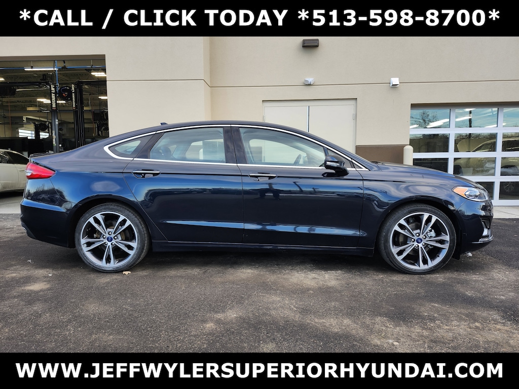 Jeff Wyler Superior Hyundai is very proud to offer this wonderful-looking 2020 Ford Fusion Titanium in Blue. Well equipped with: Equipment Group 250A, 6-Speed Automatic, AWD, 12 Speakers, 4-Wheel Disc Brakes, ABS brakes, Air Conditioning, Alloy wheels, AM/FM radio: SiriusXM, Auto High-beam Headlights, Auto-dimming door mirrors, Auto-dimming Rear-View mirror, Automatic temperature control, Brake assist, Bumpers: body-color, CD player, Compass, Delay-off headlights, Driver door bin, Driver vanity mirror, Dual front impact airbags, Dual front side impact airbags, Electronic Stability Control, Emergency communication system: SYNC 3 911 Assist, Exterior Parking Camera Rear, Four wheel independent suspension, Front anti-roll bar, Front Bucket Seats, Front Center Armrest, Front dual zone A/C, Front fog lights, Front reading lights, Fully automatic headlights, Garage door transmitter, Heated door mirrors, Heated front seats, Heated steering wheel, Illuminated entry, Knee airbag, Leather Heated/Cooled Sport Bucket Seats, Low tire pressure warning, Memory seat, Navigation System, Occupant sensing airbag, Outside temperature display, Overhead airbag, Overhead console, Panic alarm, Passenger door bin, Passenger vanity mirror, Power door mirrors, Power driver seat, Power moonroof, Power passenger seat, Power steering, Power windows, Radio data system, Radio: Sony AM/FM Single-CD/MP3, Rain sensing wipers, Rear anti-roll bar, Rear reading lights, Rear seat center armrest, Rear window defroster, Remote keyless entry, Security system, SiriusXM Radio, Speed control, Speed-sensing steering, Speed-Sensitive Wipers, Split folding rear seat, Spoiler, Steering wheel mounted audio controls, SYNC 3 Communications & Entertainment System, Tachometer, Telescoping steering wheel, Tilt steering wheel, Traction control, Trip computer, Turn signal indicator mirrors, Variably intermittent wipers, Ventilated front seats, Voice-Activated Touchscreen Navigation System, and Wheels: 19" Machined-Face Aluminum. Clean CARFAX. This sales price excludes tax, title, and dealer fees. While every reasonable effort is made to ensure the accuracy of this information, we are not responsible for any errors or omissions contained on these pages. Used vehicles 10 years of age or newer with less than 100,000 miles are eligible for the Wyler Assurance Program, but eligible vehicles must pass our reconditioning process and multi-point inspection. Provided the vehicle passes inspection, vehicles will be eligible for the 6 month/6,000 mile limited warranty. The 6 month/6,000 mile limited warranty is NOT available on AS-IS vehicles, wholesale vehicles, lease buyback/pass-thru vehicles or un-inspected vehicles. Note that this program can also apply to vehicles where the remaining factory coverage is less than 6 months or 6,000 miles. Please check the Federal Trade Commission (FTC) Buyers guide on the vehicle for full details as to whether or not warranty coverage may apply. Contact Dealer for additional details. The Wyler Assurance 6 month/6,000 Mile limited warranty ends 6 months from the date of the Retail Purchase Agreement (BUYERS ORDER) or when the vehicle's odometer registers 6,000 additional miles to the mileage listed on the BUYERS ORDER, whichever comes first.Your Deductible - The warranty holder on your contract pays the first $100 of each covered repair.