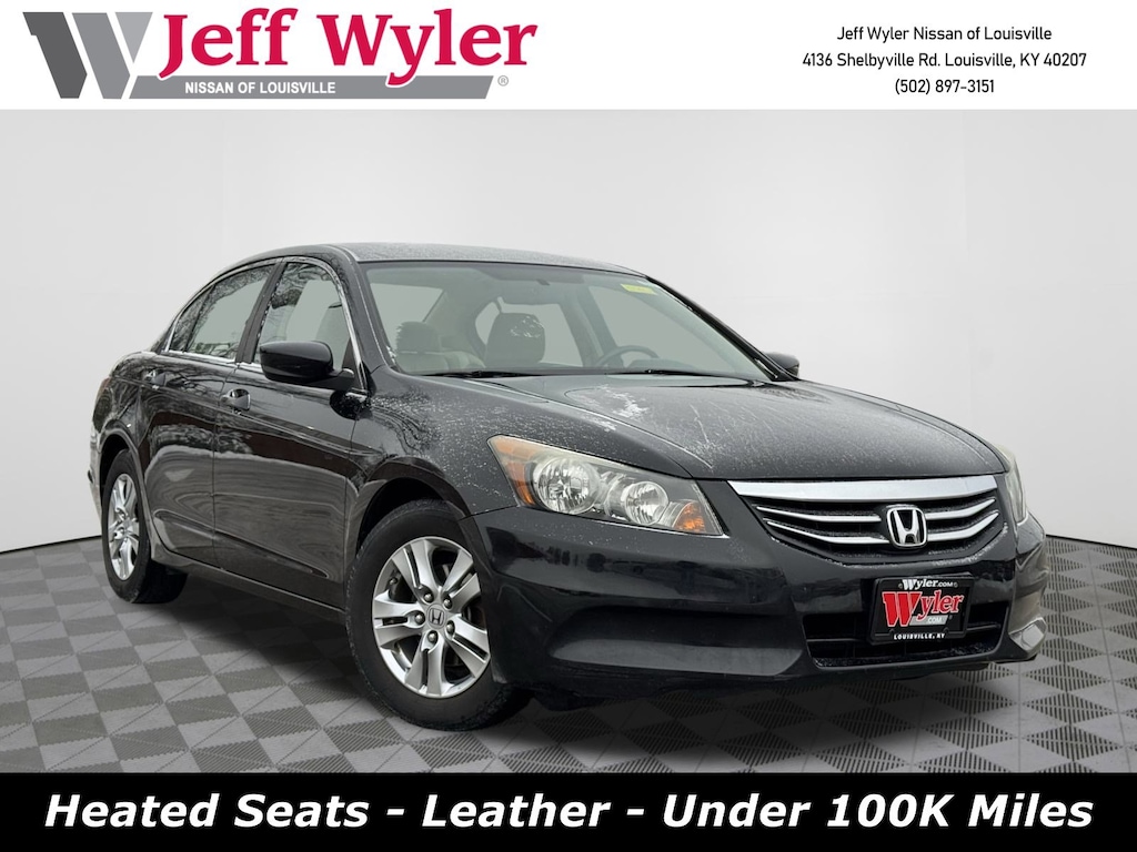 Jeff Wyler Nissan of Louisville is pumped up to offer this wonderful 2011 Honda Accord SE in Crystal Black Pearl. ** ONE-OWNER CARFAX **, ** BLUETOOTH **, ** BACKUP CAMERA **, ** LEATHER INTERIOR **, ** HEATED SEATS **, ** EXCELLENT SERVICE HISTORY **, ** LOCALLY OWNED **, and ** HOME DELIVERY OPTIONS! ** Black w/Leather-Trimmed Seat Trim, 16" Alloy Wheels, 160-Watt AM/FM/CD Audio System, 4-Wheel Disc Brakes, 6 Speakers, ABS brakes, Air Conditioning, Alloy wheels, AM/FM radio, Anti-whiplash front head restraints, Brake assist, Bumpers: body-color, CD player, Delay-off headlights, Driver door bin, Driver vanity mirror, Dual front impact airbags, Dual front side impact airbags, Electronic Stability Control, Four wheel independent suspension, Front anti-roll bar, Front Bucket Seats, Front Center Armrest, Front reading lights, Heated Front Bucket Seats, Heated front seats, Illuminated entry, Leather Shift Knob, Leather-Trimmed Seat Trim, Low tire pressure warning, Occupant sensing airbag, Overhead airbag, Overhead console, Panic alarm, Passenger door bin, Passenger vanity mirror, Power door mirrors, Power driver seat, Power steering, Power windows, Radio data system, Rear anti-roll bar, Rear seat center armrest, Rear window defroster, Remote keyless entry, Security system, Speed control, Speed-sensing steering, Speed-Sensitive Wipers, Steering wheel mounted audio controls, Tachometer, Telescoping steering wheel, Tilt steering wheel, Traction control, and Variably intermittent wipers Our PRE-OWNED vehicles are put through a rigorous 167- POINT QUALITY ASSURANCE INSPECTION along with an average amount of over $1,400.00 SPENT to recondition each vehicle so we can be sure to deliver you the highest quality vehicle like you deserve! ***ONLINE PRICE DOES NOT INCLUDE WYLER FAMILY FIRST PACKAGE*** Stop by 4136 Shelbyville Road to see for yourself, or give us a call @ 502-897-3151 to schedule your test drive! ** ONE-OWNER CARFAX **, ** BLUETOOTH **, ** BACKUP CAMERA **, ** LEATHER INTERIOR **, ** HEATED SEATS **, ** EXCELLENT SERVICE HISTORY **, ** LOCALLY OWNED **, Black w/Leather-Trimmed Seat Trim.