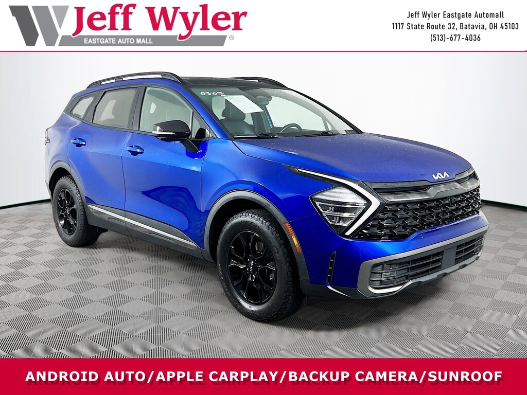 Jeff Wyler Eastgate Auto Mall is excited to offer this wonderful 2023 Kia Sportage X-Pro Prestige in Sapphire Blue. Well equipped with: 4-Wheel Disc Brakes, 8 Speakers, ABS brakes, Air Conditioning, Alloy wheels, AM/FM radio: SiriusXM, Apple CarPlay & Android Auto, Auto High-beam Headlights, Auto-dimming Rear-View mirror, Automatic temperature control, Axle Ratio: 3.648, Brake assist, Bumpers: body-color, Cargo Mat, Cargo Net Hybrid w/Audio, Carpeted Floor Mats, Compass, Delay-off headlights, Driver door bin, Driver vanity mirror, Dual front impact airbags, Dual front side impact airbags, Electronic Stability Control, Emergency communication system, Four wheel independent suspension, Front anti-roll bar, Front Bucket Seats, Front Center Armrest, Front dual zone A/C, Front fog lights, Front reading lights, Fully automatic headlights, Garage door transmitter: HomeLink, harman/kardon® Speakers, Heated & Ventilated Front Bucket Seats, Heated door mirrors, Heated front seats, Heated steering wheel, Illuminated entry, Leather Shift Knob, Leather steering wheel, Low tire pressure warning, Memory seat, Navigation System, Occupant sensing airbag, Outside temperature display, Overhead airbag, Overhead console, Panic alarm, Passenger door bin, Passenger vanity mirror, Power door mirrors, Power driver seat, Power Liftgate, Power moonroof, Power passenger seat, Power steering, Power windows, Premium Leatherette Seat Trim, Radio: AM/FM/HD Audio System, Rain sensing wipers, Rear anti-roll bar, Rear reading lights, Rear seat center armrest, Rear window defroster, Rear window wiper, Remote keyless entry, Security system, Speed control, Speed-sensing steering, Split folding rear seat, Spoiler, Steering wheel mounted audio controls, Tachometer, Telescoping steering wheel, Tilt steering wheel, Traction control, Trip computer, Turn signal indicator mirrors, Variably intermittent wipers, Ventilated front seats, and Wheels: 17" Matte Black Alloy. CARFAX One-Owner. Clean CARFAX. Ask about available certifications. Used vehicles 10 years of age or newer with less than 100,000 miles are eligible for the Wyler Assurance Program, but eligible vehicles must pass our reconditioning process and multi-point inspection. Provided the vehicle passes inspection, vehicles will be eligible for the 6 month/6,000 mile limited warranty. The 6 month/6,000 mile limited warranty is NOT available on AS-IS vehicles, wholesale vehicles, lease buyback/pass-thru vehicles or un-inspected vehicles. Note that this program can also apply to vehicles where the remaining factory coverage is less than 6 months or 6,000 miles. Please check the Federal Trade Commission (FTC) Buyers guide on the vehicle for full details as to whether or not warranty coverage may apply. Contact Dealer for additional details. The Wyler Assurance 6 month/6,000 Mile limited warranty ends 6 months from the date of the Retail Purchase Agreement (BUYERS ORDER) or when the vehicle's odometer registers 6,000 additional miles to the mileage listed on the BUYERS ORDER, whichever comes first. Your Deductible - The warranty holder on your contract pays the first $100 of each covered repair.
