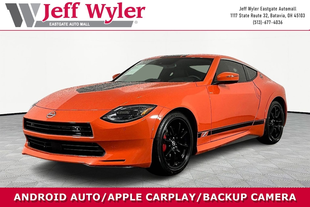 Jeff Wyler Eastgate Auto Mall is very proud to offer this outstanding-looking 2024 Nissan Z Performance in New Sight Orange. Well equipped with: Floor Mat Package (First Aid Kit), Heritage Edition (Wheel: 19" Watanabe Style Alloy), 4-Wheel Disc Brakes, 8 Speakers, ABS brakes, Air Conditioning, Alloy wheels, AM/FM radio: SiriusXM, Auto High-beam Headlights, Auto-dimming Rear-View mirror, Automatic temperature control, Blind Spot Warning, Brake assist, Bumpers: body-color, Compass, Delay-off headlights, Driver door bin, Driver vanity mirror, Dual front impact airbags, Dual front side impact airbags, Electronic Stability Control, Emergency communication system: NissanConnect Services, Four wheel independent suspension, Front anti-roll bar, Front Bucket Seats, Front Center Armrest, Front reading lights, Fully automatic headlights, Garage door transmitter, Heated door mirrors, Heated Front Bucket Seats, Heated front seats, Heritage Edition (K11), Illuminated Kick Plate - Black Metallic, Interior Door Scuff Protection, Leather Shift Knob, Leather steering wheel, Leather-Appointed Seat Trim, Low tire pressure warning, Navigation system: NissanConnect with Navigation and Services, Occupant sensing airbag, Outside temperature display, Overhead airbag, Panic alarm, Passenger door bin, Passenger vanity mirror, Power door mirrors, Power driver seat, Power passenger seat, Power steering, Power windows, Radio data system, Radio: Bose Audio System w/8 Speakers, Rear anti-roll bar, Rear window defroster, Remote keyless entry, Security system, Speed control, Speed-sensing steering, Spoiler, Steering wheel mounted audio controls, Tachometer, Telescoping steering wheel, Tilt steering wheel, Traction control, Trip computer, Turn signal indicator mirrors, Variably intermittent wipers, Voltmeter, and Wheels: 19" RAYS Super-Lightweight Forged Alloy. CARFAX One-Owner. Clean CARFAX. Ask about available certifications. Used vehicles 10 years of age or newer with less than 100,000 miles are eligible for the Wyler Assurance Program, but eligible vehicles must pass our reconditioning process and multi-point inspection. Provided the vehicle passes inspection, vehicles will be eligible for the 6 month/6,000 mile limited warranty. The 6 month/6,000 mile limited warranty is NOT available on AS-IS vehicles, wholesale vehicles, lease buyback/pass-thru vehicles or un-inspected vehicles. Note that this program can also apply to vehicles where the remaining factory coverage is less than 6 months or 6,000 miles. Please check the Federal Trade Commission (FTC) Buyers guide on the vehicle for full details as to whether or not warranty coverage may apply. Contact Dealer for additional details. The Wyler Assurance 6 month/6,000 Mile limited warranty ends 6 months from the date of the Retail Purchase Agreement (BUYERS ORDER) or when the vehicle's odometer registers 6,000 additional miles to the mileage listed on the BUYERS ORDER, whichever comes first. Your Deductible - The warranty holder on your contract pays the first $100 of each covered repair.