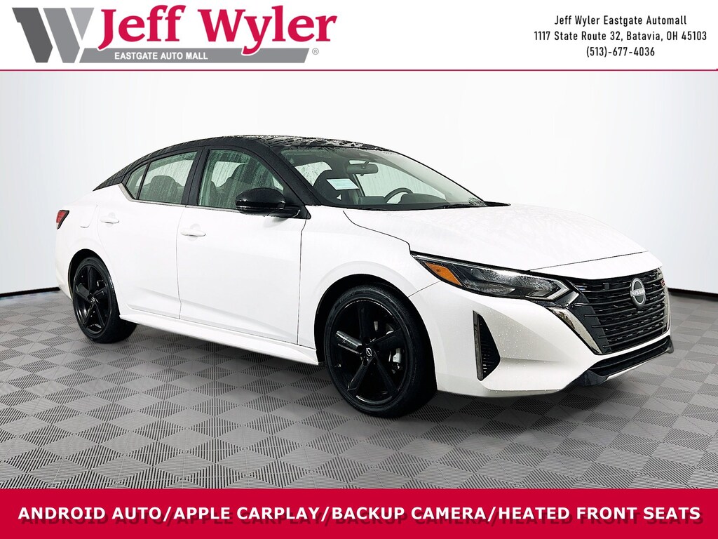Jeff Wyler Eastgate Auto Mall is pumped up to offer this great-looking 2025 Nissan Sentra SR in Aspen White Tricoat/Super Black. Well equipped with: 18" Alloy Wheels, 18" Black Alloy Wheels, 2-Tone Premium Paint, 4-Wheel Disc Brakes, 8 Speakers, ABS brakes, Air Conditioning, Alloy wheels, AM/FM radio: SiriusXM, Auto High-beam Headlights, Automatic temperature control, Blind Spot Warning, Brake assist, Bumpers: body-color, Clear Rear Bumper Protector, Delay-off headlights, Door Sill Plates, Driver door bin, Driver vanity mirror, Dual front impact airbags, Dual front side impact airbags, Electronic Stability Control, Four wheel independent suspension, Front anti-roll bar, Front Bucket Seats, Front Center Armrest, Front dual zone A/C, Front reading lights, Fully automatic headlights, Heated door mirrors, Heated Front Bucket Seats, Heated front seats, Illuminated entry, Knee airbag, Leather Shift Knob, Low tire pressure warning, Map Pocket Lighting, NissanConnect featuring Apple CarPlay and Android Auto, Occupant sensing airbag, Outside temperature display, Overhead airbag, Overhead console, Panic alarm, Passenger door bin, Passenger vanity mirror, Power door mirrors, Power steering, Power windows, Radio data system, Rear anti-roll bar, Rear Parking Sensors, Rear seat center armrest, Rear side impact airbag, Rear window defroster, Remote keyless entry, Security system, Speed control, Speed-sensing steering, Split folding rear seat, Spoiler, Sport Cloth Seat Trim, Steering wheel mounted audio controls, Tachometer, Telescoping steering wheel, Tilt steering wheel, Traction control, Trip computer, Turn signal indicator mirrors, and Variably intermittent wipers. CARFAX One-Owner. Clean CARFAX. Ask about available certifications. Used vehicles 10 years of age or newer with less than 100,000 miles are eligible for the Wyler Assurance Program, but eligible vehicles must pass our reconditioning process and multi-point inspection. Provided the vehicle passes inspection, vehicles will be eligible for the 6 month/6,000 mile limited warranty. The 6 month/6,000 mile limited warranty is NOT available on AS-IS vehicles, wholesale vehicles, lease buyback/pass-thru vehicles or un-inspected vehicles. Note that this program can also apply to vehicles where the remaining factory coverage is less than 6 months or 6,000 miles. Please check the Federal Trade Commission (FTC) Buyers guide on the vehicle for full details as to whether or not warranty coverage may apply. Contact Dealer for additional details. The Wyler Assurance 6 month/6,000 Mile limited warranty ends 6 months from the date of the Retail Purchase Agreement (BUYERS ORDER) or when the vehicle's odometer registers 6,000 additional miles to the mileage listed on the BUYERS ORDER, whichever comes first. Your Deductible - The warranty holder on your contract pays the first $100 of each covered repair.