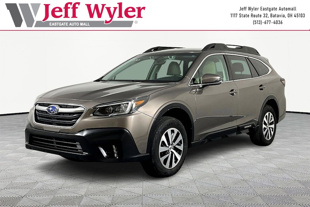 Jeff Wyler Eastgate Auto Mall is pleased to offer this handsome 2021 Subaru Outback Premium in Brilliant Bronze Metallic. Well equipped with: BSD w/RCTA & Keyless Access & Push Button Start (Blind Spot Detection (BSD), Hands-Free Power Rear Gate, Keyless Access w/Push Button Start, and Rear Cross Traffic Alert (RCTA)), Popular Package #1 (All-Weather Floor Liners, Auto-Dimming Exterior Mirror w/Approach Light, Auto-Dimming Mirror w/Compass & HomeLink, Dome Light LED Upgrade, and Rear Bumper Cover), 3.90 Axle Ratio, 4-Wheel Disc Brakes, 6 Speakers, ABS brakes, Air Conditioning, Alloy wheels, AM/FM radio: SiriusXM, Auto High-beam Headlights, Automatic temperature control, Brake assist, Bumpers: body-color, Cloth Upholstery, Driver door bin, Driver vanity mirror, Dual front impact airbags, Dual front side impact airbags, Electronic Stability Control, Emergency communication system: STARLINK Safety and Security (Subscription Required), Exterior Parking Camera Rear, Four wheel independent suspension, Front anti-roll bar, Front Bucket Seats, Front Center Armrest w/Storage, Front dual zone A/C, Front fog lights, Front reading lights, Fully automatic headlights, Heated door mirrors, Heated Front Bucket Seats, Heated front seats, Illuminated entry, Knee airbag, Leather steering wheel, Low tire pressure warning, Occupant sensing airbag, Outside temperature display, Overhead airbag, Overhead console, Panic alarm, Passenger door bin, Passenger vanity mirror, Power door mirrors, Power driver seat, Power steering, Power windows, Radio: Subaru STARLINK 11.6" Multimedia Plus Sys, Rear anti-roll bar, Rear seat center armrest, Rear window defroster, Rear window wiper, Remote keyless entry, Roof rack, Security system, Speed control, Speed-sensing steering, Split folding rear seat, Spoiler, STARLINK/Apple CarPlay/Android Auto, Steering wheel mounted audio controls, Steering Wheel Paddle Shift Control Switches, Tachometer, Telescoping steering wheel, Tilt steering wheel, Traction control, Trip computer, Turn signal indicator mirrors, Variably intermittent wipers, and Wheels: 17" x 7J Black Aluminum Alloy. Clean CARFAX. Ask about available certifications. Used vehicles 10 years of age or newer with less than 100,000 miles are eligible for the Wyler Assurance Program, but eligible vehicles must pass our reconditioning process and multi-point inspection. Provided the vehicle passes inspection, vehicles will be eligible for the 6 month/6,000 mile limited warranty. The 6 month/6,000 mile limited warranty is NOT available on AS-IS vehicles, wholesale vehicles, lease buyback/pass-thru vehicles or un-inspected vehicles. Note that this program can also apply to vehicles where the remaining factory coverage is less than 6 months or 6,000 miles. Please check the Federal Trade Commission (FTC) Buyers guide on the vehicle for full details as to whether or not warranty coverage may apply. Contact Dealer for additional details. The Wyler Assurance 6 month/6,000 Mile limited warranty ends 6 months from the date of the Retail Purchase Agreement (BUYERS ORDER) or when the vehicle's odometer registers 6,000 additional miles to the mileage listed on the BUYERS ORDER, whichever comes first. Your Deductible - The warranty holder on your contract pays the first $100 of each covered repair.