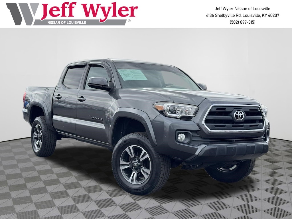 Jeff Wyler Nissan of Louisville is very proud to offer this robust, reliable 2017 Toyota Tacoma SR5 in Cement. ** ALL WHEEL DRIVE/AWD **, ** CLEAN CARFAX REPORT **, ** BLUETOOTH **, ** BACKUP CAMERA **, ** 6-CYLINDER ENGINE **, ** EXCELLENT SERVICE HISTORY **, and ** LOCALLY OWNED ** 4WD, 16" Silver Alloy Wheels, 6 Speakers, ABS brakes, Air Conditioning, Alloy wheels, AM/FM radio: SiriusXM, Anti-whiplash front head restraints, Auto-Dimming Inside Rear-View Mirror w/Compass, Auto-dimming Rear-View mirror, Axle Ratio: 3.91, Brake assist, Bumpers: body-color, CD player, Chrome Rear Bumper, Color-Keyed Overfenders, Compass, Cruise Control, Daytime Running Lamps, Driver door bin, Dual front impact airbags, Dual front side impact airbags, Electronic Stability Control, Exterior Parking Camera Rear, Fabric Seat Trim (FC), Front anti-roll bar, Front Bucket Seats, Front Center Armrest, Front Fog Lamps, Front fog lights, Front reading lights, Front wheel independent suspension, Illuminated entry, Knee airbag, Low tire pressure warning, Occupant sensing airbag, Outside temperature display, Overhead airbag, Overhead console, Panic alarm, Passenger door bin, Power door mirrors, Power steering, Power windows, Radio: Entune Plus AM/FM/CD w/Connected Navigation, Rear step bumper, Remote keyless entry, Remote Keyless Entry System, Speed control, Speed-sensing steering, Split folding rear seat, Steering wheel mounted audio controls, Tachometer, Telescoping steering wheel, Tilt steering wheel, Traction control, Trip computer, Variable Intermittent Wipers, and Variably intermittent wipers Our PRE-OWNED vehicles are put through a rigorous 167- POINT QUALITY ASSURANCE INSPECTION along with an average amount of over $1,400.00 SPENT to recondition each vehicle so we can be sure to deliver you the highest quality vehicle like you deserve! ***ONLINE PRICE DOES NOT INCLUDE WYLER FAMILY FIRST PACKAGE*** Stop by 4136 Shelbyville Road to see for yourself, or give us a call @ 502-897-3151 to schedule your test drive! ** ALL WHEEL DRIVE/AWD **, ** CLEAN CARFAX REPORT **, ** BLUETOOTH **, ** BACKUP CAMERA **, ** 6-CYLINDER ENGINE **, ** EXCELLENT SERVICE HISTORY **, ** LOCALLY OWNED **, 4WD, 16" Silver Alloy Wheels, 6 Speakers, ABS brakes, Air Conditioning, Alloy wheels, AM/FM radio: SiriusXM, Anti-whiplash front head restraints, Auto-Dimming Inside Rear-View Mirror w/Compass, Auto-dimming Rear-View mirror, Axle Ratio: 3.91, Brake assist, Bumpers: body-color, CD player, Chrome Rear Bumper, Color-Keyed Overfenders, Compass, Cruise Control, Daytime Running Lamps, Driver door bin, Dual front impact airbags, Dual front side impact airbags, Electronic Stability Control, Exterior Parking Camera Rear, Fabric Seat Trim (FC), Front anti-roll bar, Front Bucket Seats, Front Center Armrest, Front Fog Lamps, Front fog lights, Front reading lights, Front wheel independent suspension, Illuminated entry, Knee airbag, Low tire pressure warning, Occupant sensing airbag, Outside temperature display, Overhead airbag, Overhead console, Panic alarm, Passenger door bin, Power door mirrors, Power steering, Power windows, Radio: Entune Plus AM/FM/CD w/Connected Navigation, Rear step bumper, Remote keyless entry, Remote Keyless Entry System, Speed control, Speed-sensing steering, Split folding rear seat, Steering wheel mounted audio controls, Tachometer, Telescoping steering wheel, Tilt steering wheel, Traction control, Trip computer, Variable Intermittent Wipers, Variably intermittent wipers.